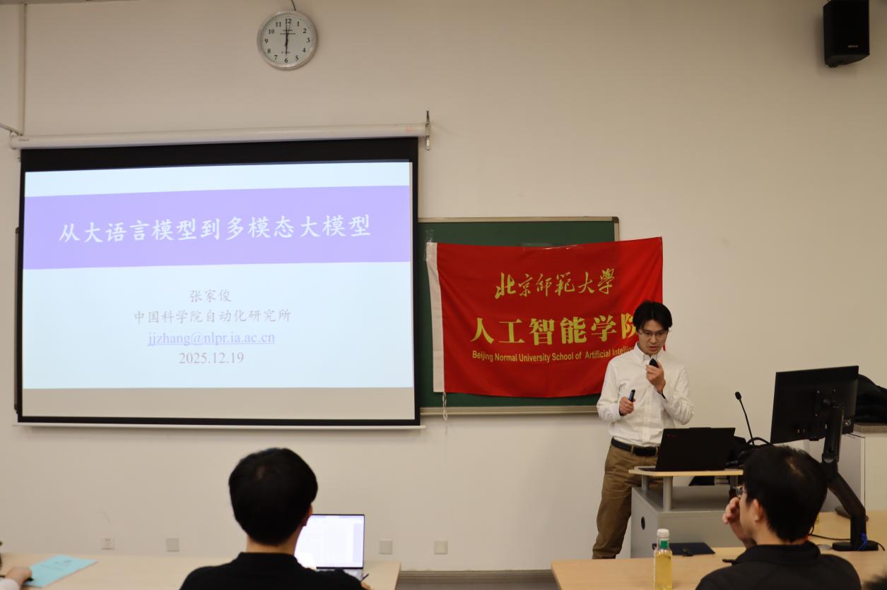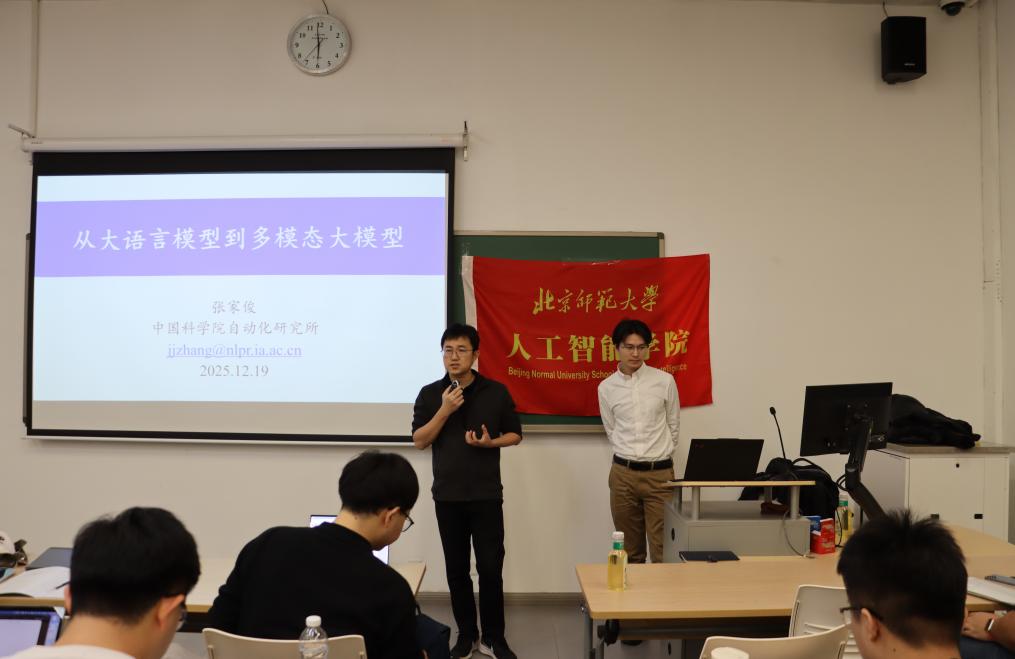 2025年12月19日,sunbet申搏官方网站智能学术沙龙第四十四期在昌平校园成功举办。本期报告邀请到了中国科学院自动化研究所研究员、博士生导师、中国科学院大学岗位教授张家俊老师。张老师主要研究方向为自然语言处理、多语言多模态大模型,获得国家优秀青年科学基金资助,入选中国科协首届青年人才托举工程、中国科学院青年创新促进会优秀会员和北京智源青年科学家,主持科技创新2030一“新一代人工智能”重大项目。出版学术专著2部、译著1部,获得北京市科学技术奖一等奖、首届祖冲之奖年度突出成果奖等。担任中国中文信息学会理事和机器翻译与多语言信息处理专委会副主任。担任Artificial Intelligence、IEEE/ACM T-ASLP和《自动化学报》等期刊的编委,担任ACL-2026的程序委员会共同主席。讲座由sunbet申搏官方网站黄永祯老师主持,现场座无虚席,学院研究生共计60人次参与。