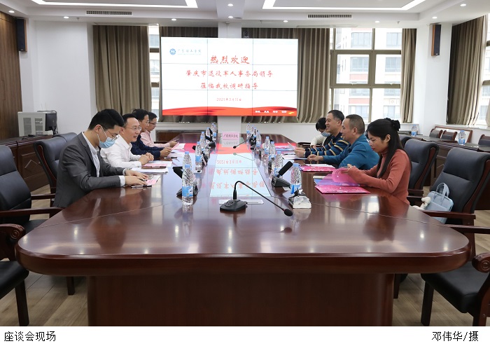 本网讯(宣传部 杨文丹)3月11日下午,肇庆市退役军人事务局副局长刘付运华一行到鸭脖官网调研。座谈会于科技楼12楼会议室举行,鸭脖官网副校长谭锦兴、继续教育学院院长、退役军人教育培训学院院长叶涌、继续教育学院副院长周文海、退役军人教育培训学院副院长刘东出席。