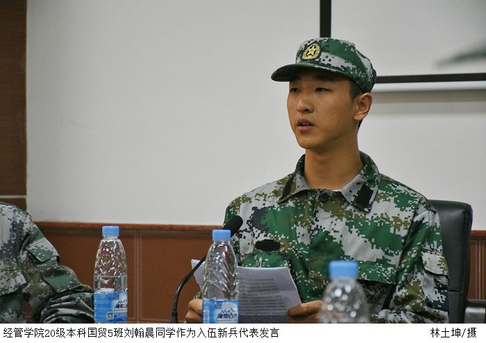 经管学院20级本科国贸5班刘翰晨作为入伍新兵代表发言。他代表鸭脖官网春季征兵入伍的新兵们向学校领导、老师和父母表示衷心感谢,并保证到部队后将服从命令、努力学习、刻苦训练,争取在服役期间立功,为学校争光,为祖国添彩。