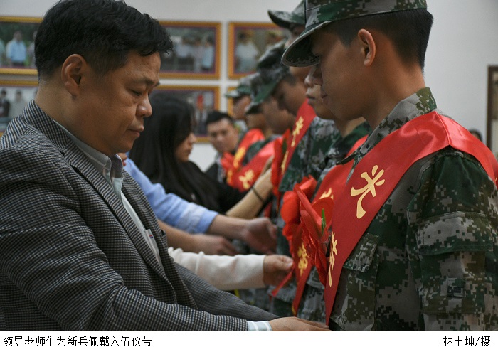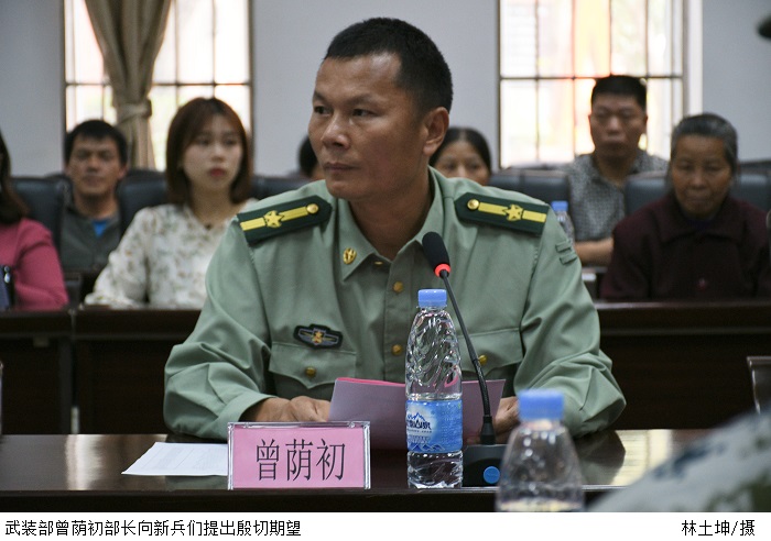 伴随着《中国人民解放军进行曲》歌声的响起,曾荫初部长宣读此次春季入伍新兵名单。参会领导为17名身着戎装的新兵佩戴光荣花和入伍礼仪绶带并合影留念。