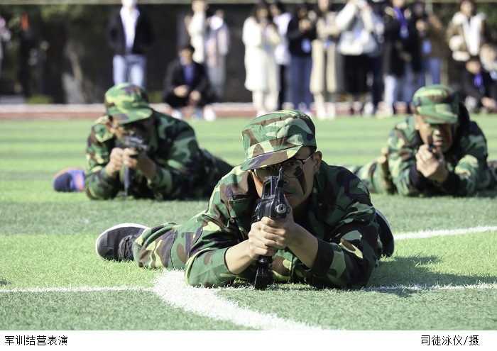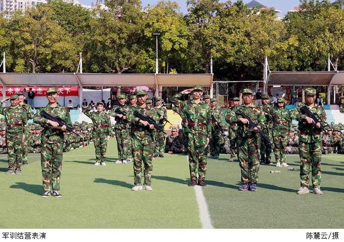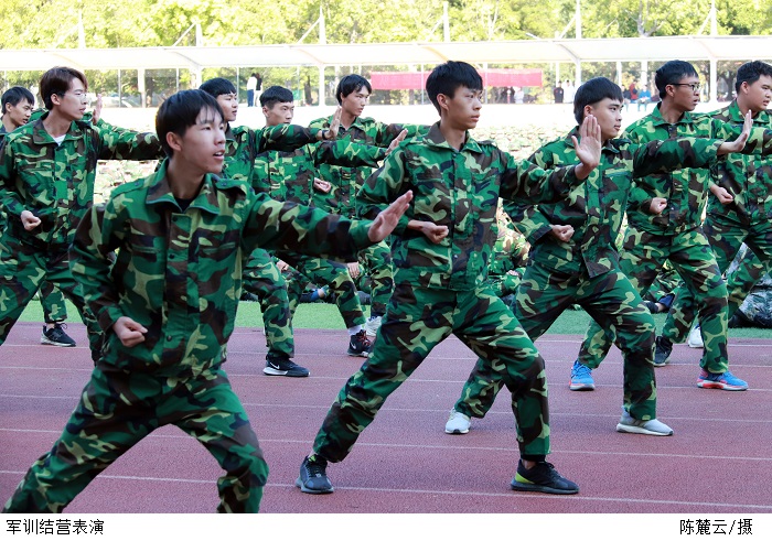 各团代表军训方阵迈着铿锵的步伐,动作整齐划一、英姿焕发。擒敌拳表演气势磅礴,一招一式尽显少年英气;匕首操表演英姿飒爽,一举一动饱含刚强自信;战术综合演练动作敏捷、灵活多变。