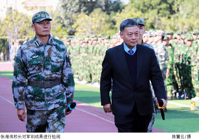 伴随着国歌声,五星红旗冉冉升起。张湘伟校长对军训成果进行检阅。