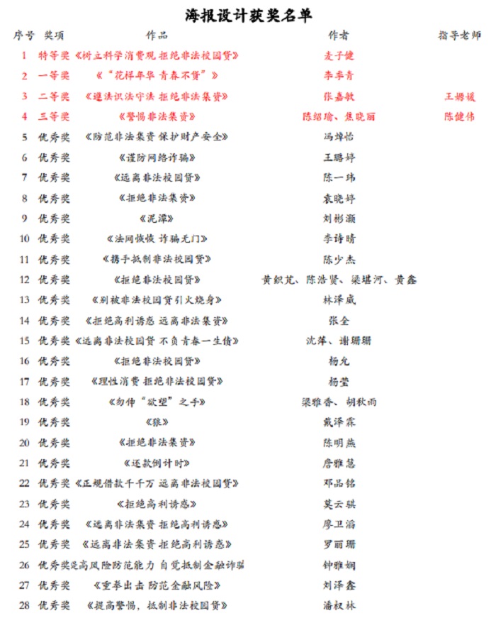 本网讯(校团委)根由广东省地方金融监督管理局、广东省教育厅、广州市地方金融监督管理局、广州市教育厅联合主办的广东省第三届高校防范非法金融活动微视频和海报设计大赛历时半年落下帷幕。