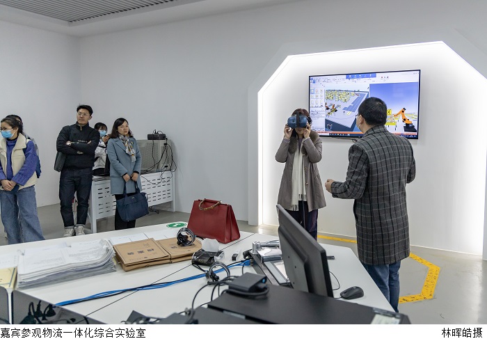 嘉宾们重点参观了鸭脖官网实验室。在机器视觉与智能检测工程技术研究中心,苏真伟教授从研发、应用及不断改进的历程介绍了实验室最新成果。在建设学院教学楼,马佳阳老师讲解了鸭脖官网实训室设备以及培训学生的大体方向,学生可以通过这些设施的演示,直观地学习建筑的过程。在物流一体化综合实验室,黄永福主任从先进的实验设备、VR系统的操作动画等方面详细地介绍鸭脖官网在VR等前沿科技的探索和研究,同时,他邀请来宾佩戴VR头盔亲自感知和体验VR技术。在电子商务产教融合一体化实训室,教学老师讲解了实训室基本情况,并对配备设施作了简单介绍。