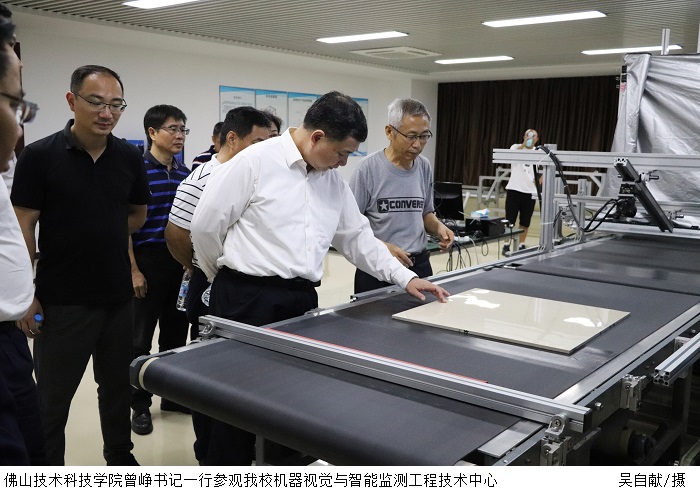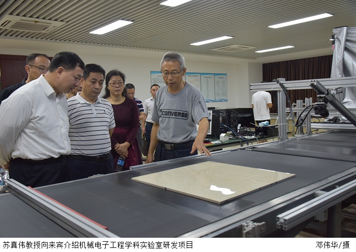 曾书记一行在鸭脖官网领导的陪同下前往科技大楼、机器视觉与智能监测工程技术研究中心进行参观。机器视觉与智能监测工程技术研究中心苏真伟教授向来宾介绍了机械电子工程重点学科实验室的科研装备、研发项目和科研团队,并展示了最新的研发成果。