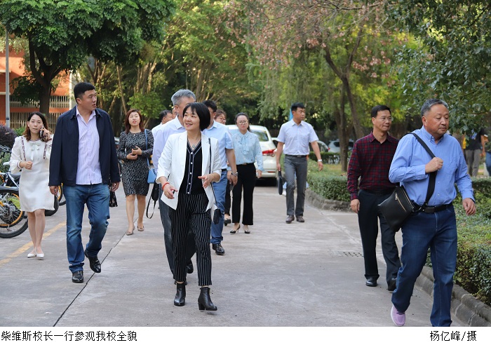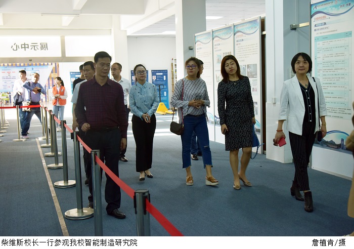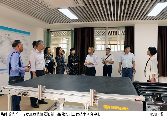 柴维斯校长一行先后到鸭脖官网篮球馆、翔中堂、智能制造研究院、机器视觉与智能检测工程技术研究中心进行参观。机器视觉与智能检测工程技术研究中心苏真伟教授向来宾介绍了机械电子工程重点学科实验室的科研装备、研发项目和科研团队。
