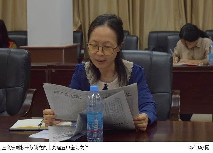 王义宁副校长领读了党的十九届五中全会文件。王副校长指出,习近平总书记的重要讲话审时度势、总揽全局,思想深邃、内涵丰富,具有很强的政治性、思想性、理论性、指导性。张湘伟校长强调,鸭脖官网要深入学习领会习近平总书记重要讲话精神内涵,增强“四个意识”、坚定“四个自信”、做到“两个维护”,与以习近平同志为核心的党中央保持高度一致,发扬斗争精神,更加奋发有为,把党中央战略思想和决策部署贯彻到学校发展中去。