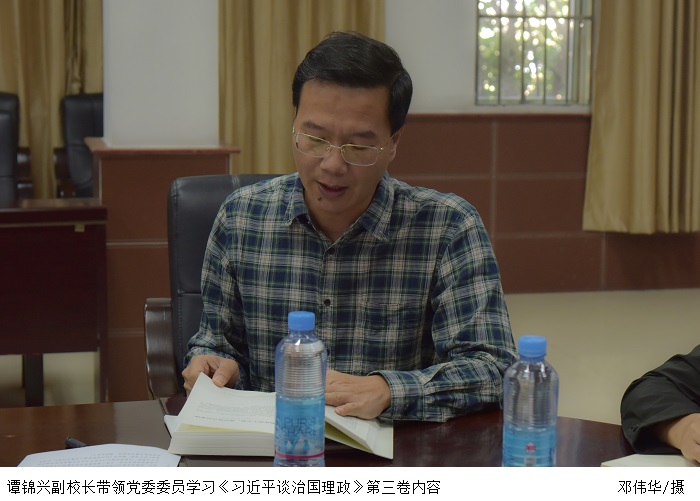 谭锦兴副校长则领读学习了《习近平谈治国理政》第三卷之《胸怀两个大局,做好自己的事情》。内容指出,领导干部要胸怀两个大局,一个是中华民族伟大复兴的战略全局,一个是世界百年未有之大变局。当前,我国仍处于发展重要战略机遇期,面对错综复杂的国际形势,最重要的还是做好自己的事情。要统筹研究部署,协同推进改革发展稳定各项工作,谋定而后动,厚积而不发,更加主动办好自己的事情。