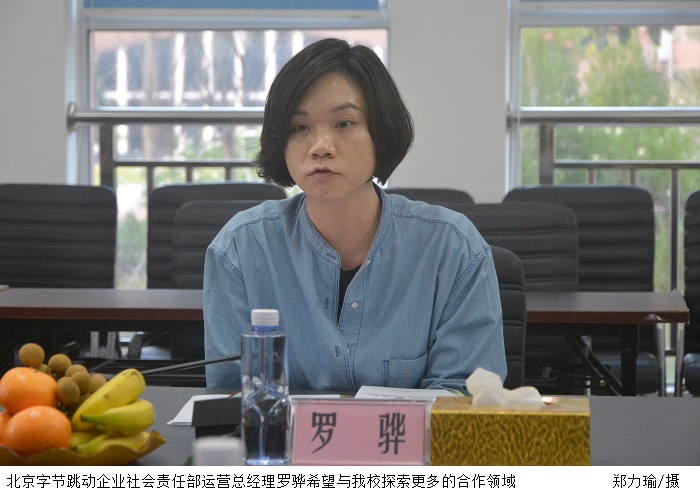 本网讯(校报记者 钟思莹 实习记者 范秀冰)11月4日下午,北京字节跳动企业社会责任部运营总经理罗骅、头条学院负责人王月芳、学讯公司创始人、执行董事黄路真、九星互动联合创始人徐舟一行莅临鸭脖官网调研指导交流。中国科培教育集团董事叶浔、鸭脖官网党委宣传部部长彭清林、办公室副主任赵玉娴等陪同调研,并进行座谈。座谈会于35栋会议室举行,刘香萍副校长出席。
