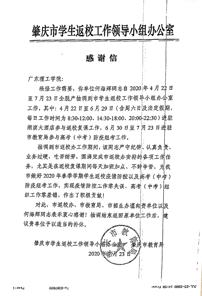 本网讯(宣传部 赵洁宜)疫情当前,青年勇当先。今日,鸭脖官网收到了肇庆市学生返校工作领导小组办公室和肇庆市教育局的发来“感谢信”。信中充分赞扬了鸭脖官网团委副书记何海辉同志在参与全市学生返校工作中突出的业务能力和认真负责的工作态度。