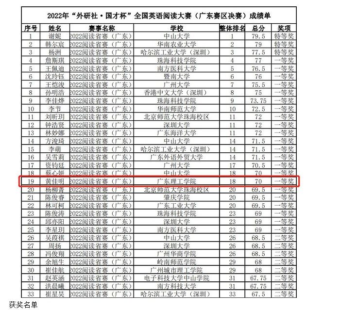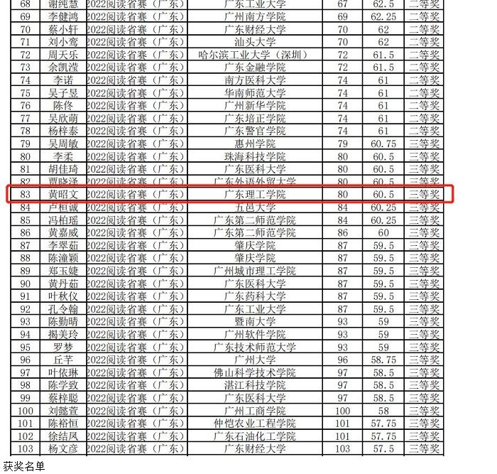 鸭脖官网2位专业组选手在阅读大赛(广东赛区决赛)中表现出色,获得可喜成绩。其中,黄佳明同学获得省级一等奖;黄昭文同学获得省级三等奖。慕容玉贞、黄小辉、谢子彬、张智龙四位老师荣获“优秀指导教师”称号。