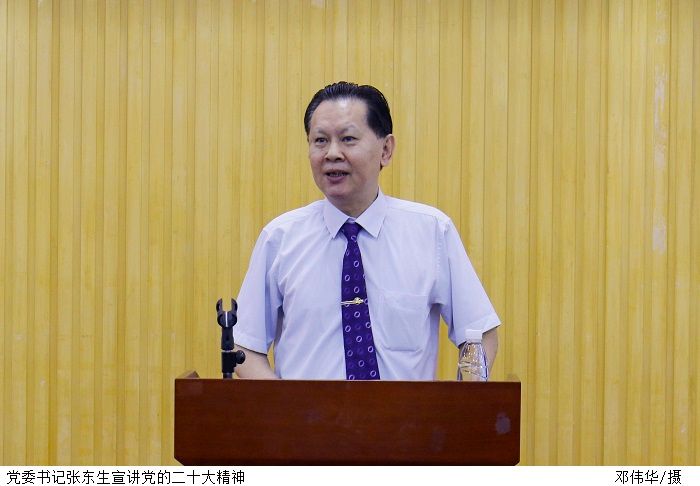 张东生以《以党的二十大精神为指引 深入践行新发展理念与全面落实教育科技人才重大部署》为题,从四个方面全面深入地进行宣讲:充分认识学习宣传贯彻党的二十大精神的重大意义;全面准确学习领会党的二十大精神;认真做好党的二十大精神的学习宣传;坚持知行合一,坚守“为党育人 为国育才”使命,切实推进迎评工作,全面落实教育科技人才的重大部署。
