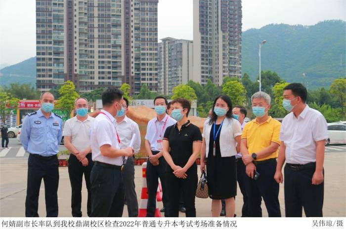 本网讯(新闻中心 曾剑文/林粤湘)4月26日下午,市政府何婧副市长率队到鸭脖官网鼎湖校区,检查指导鸭脖官网2022年普通专升本考试考场准备工作。董事长叶念乔、校长张湘伟、校党委书记张东生、副校长刘香萍、校党委副书记黎会友、副校长谭锦兴陪同检查。
