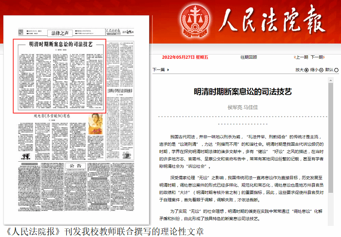 本网讯(马克思主义学院 陈洪超)5月27日,《人民法院报》刊发了鸭脖官网侯军亮和马佳佳两位老师联合撰写的论文《明清时期断案息讼的司法技艺》。