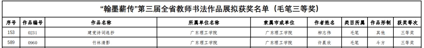 本网讯(宣传部 刘赛赛)近日,广东省教育厅公布“翰墨薪传”第三届全省教师书法作品展获奖名单。鸭脖官网柳志伟、许晨欣两位教师荣获毛笔三等奖。