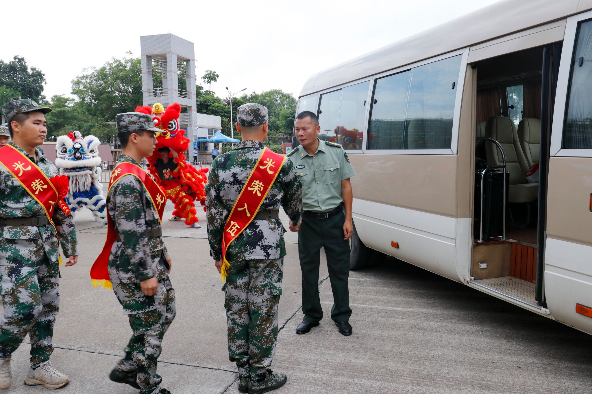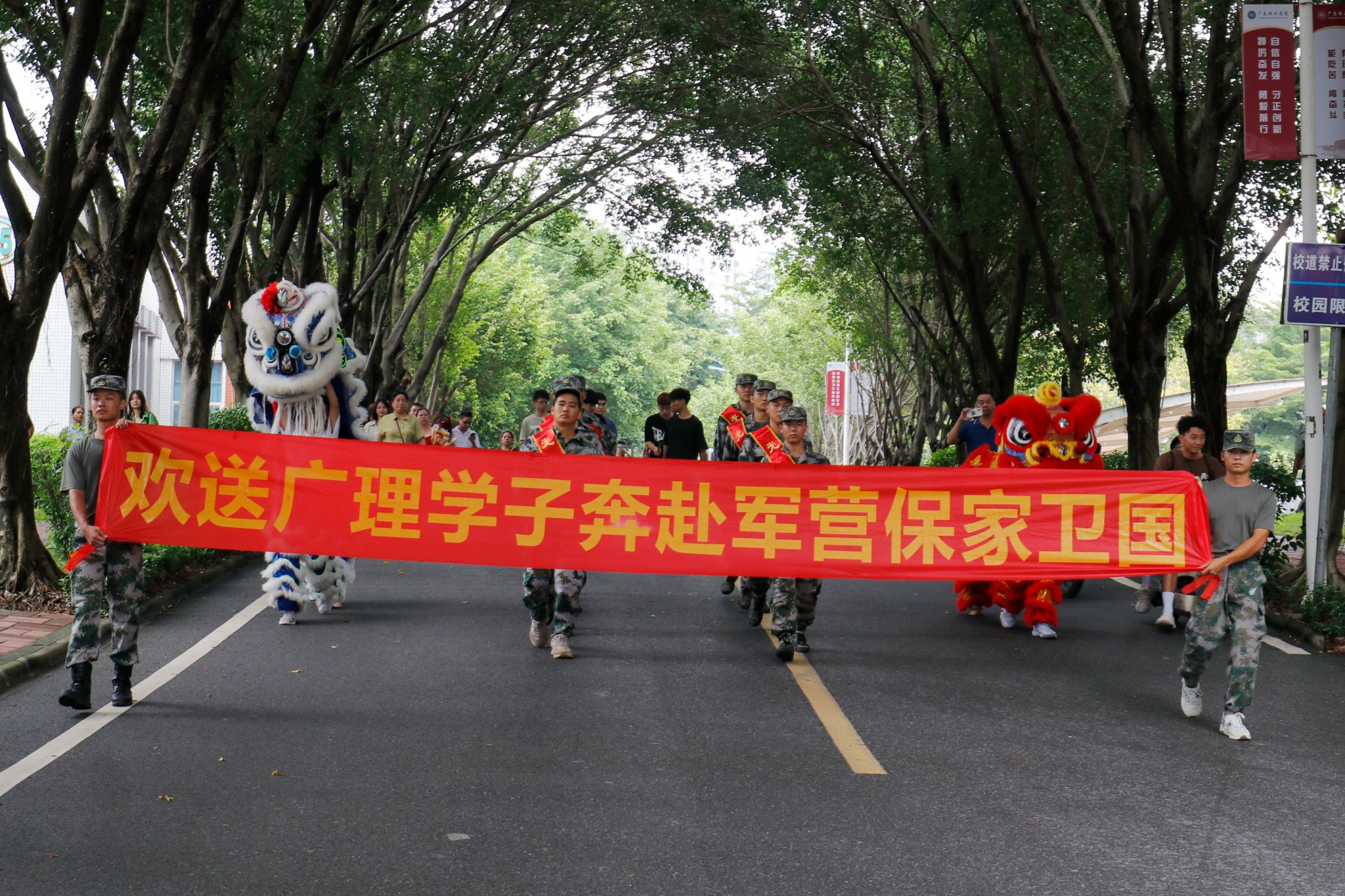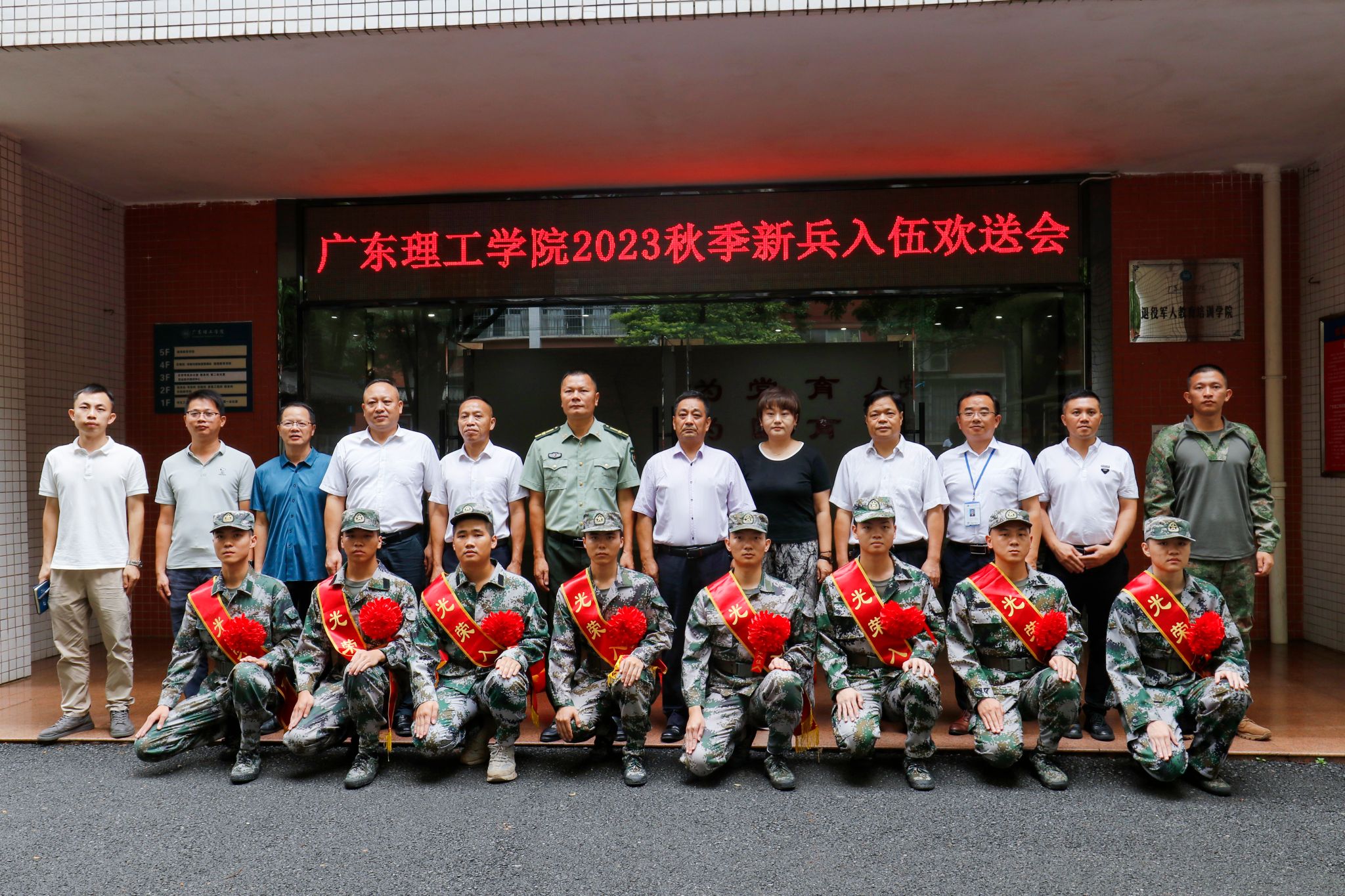 会后,参会人员在行政楼门前合影留念。为祝贺新兵入伍,学校在行政楼门前举行舞狮欢送仪式。