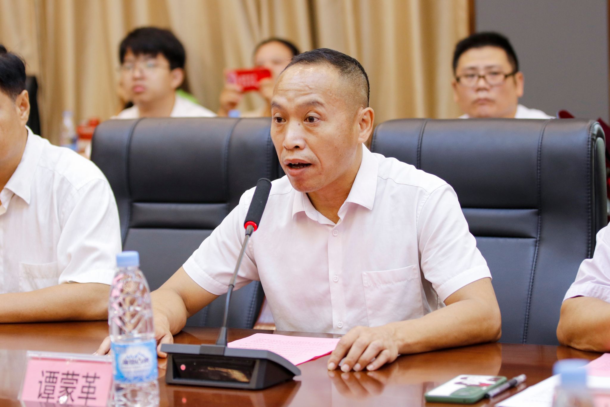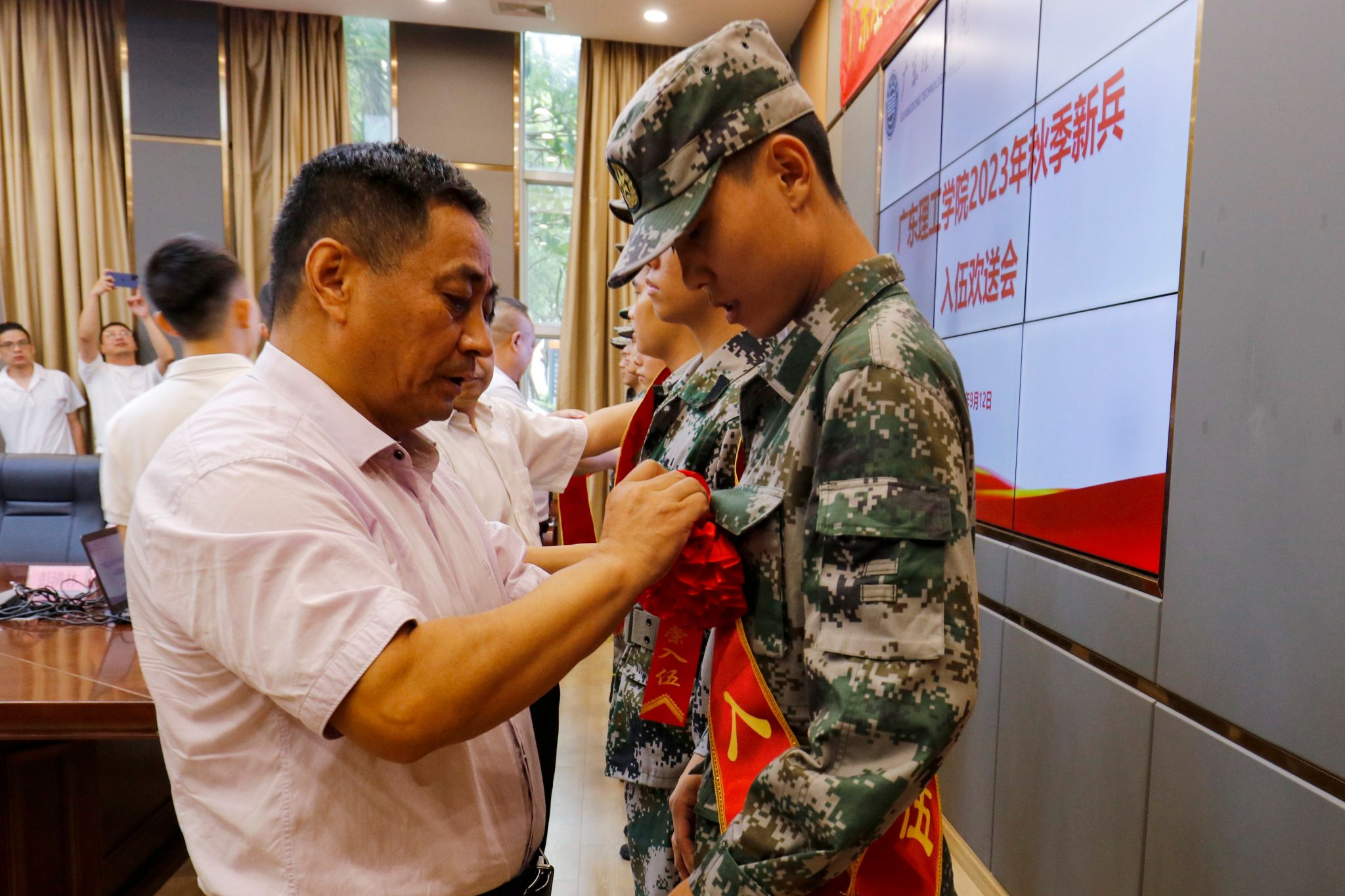 学生处处长谭蒙革宣读秋季入伍预定新兵名单,参会领导为他们佩戴绶带与大红花,建设学院2019级本科工程管理3班蒋智同学作为新兵代表发言。