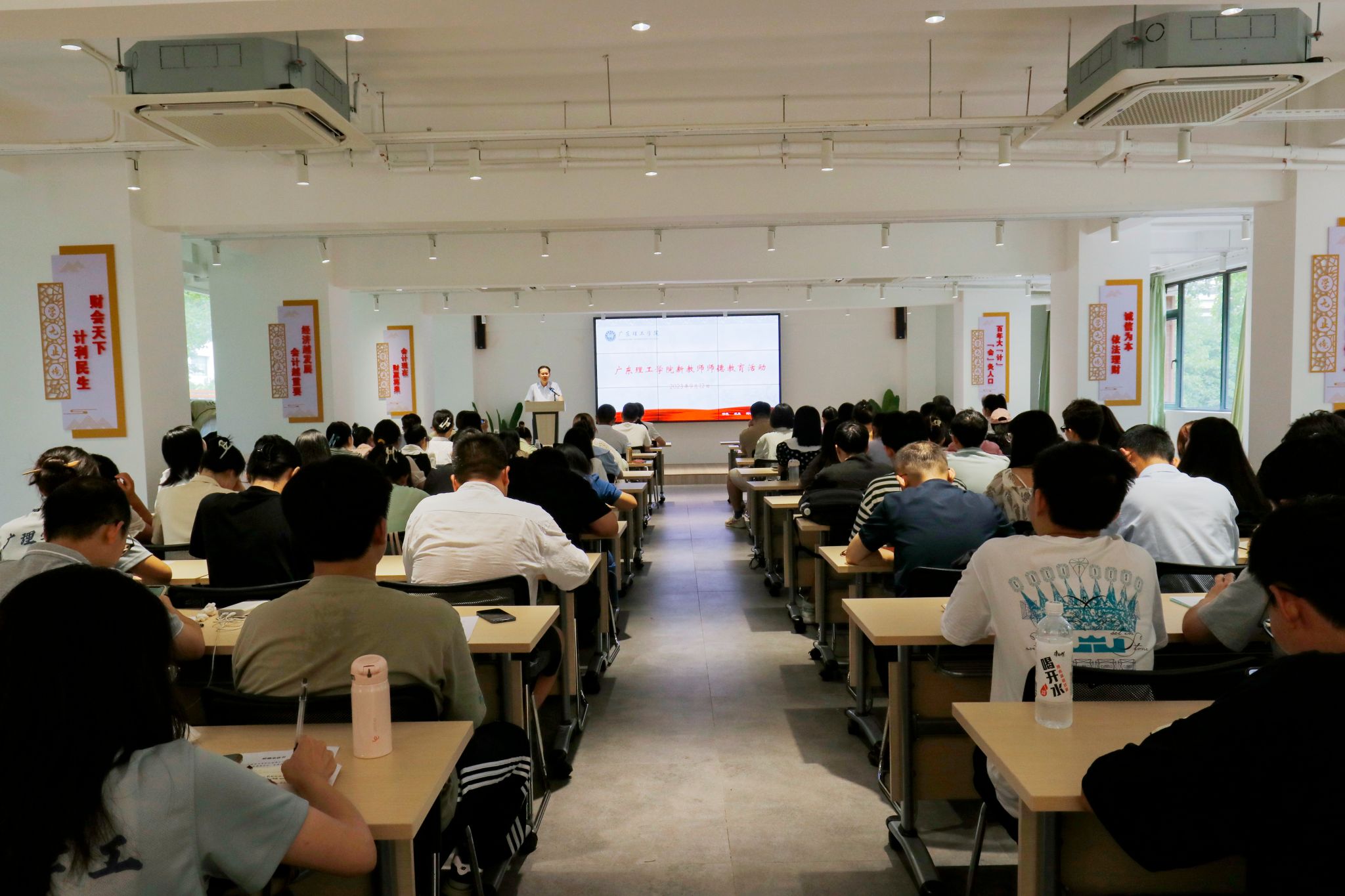 张东生首先为本年度新入职教师作题目为《敬业修德,做一名新时代师德高尚的“四有”好老师》的师德讲座。讲座分四个方面进行,一是什么是师德,二是学习习近平总书记对加强教师队伍建设、对师德建设提出的要求,三是学习老教师的优良品德,四是对新教师提出要求与希冀。