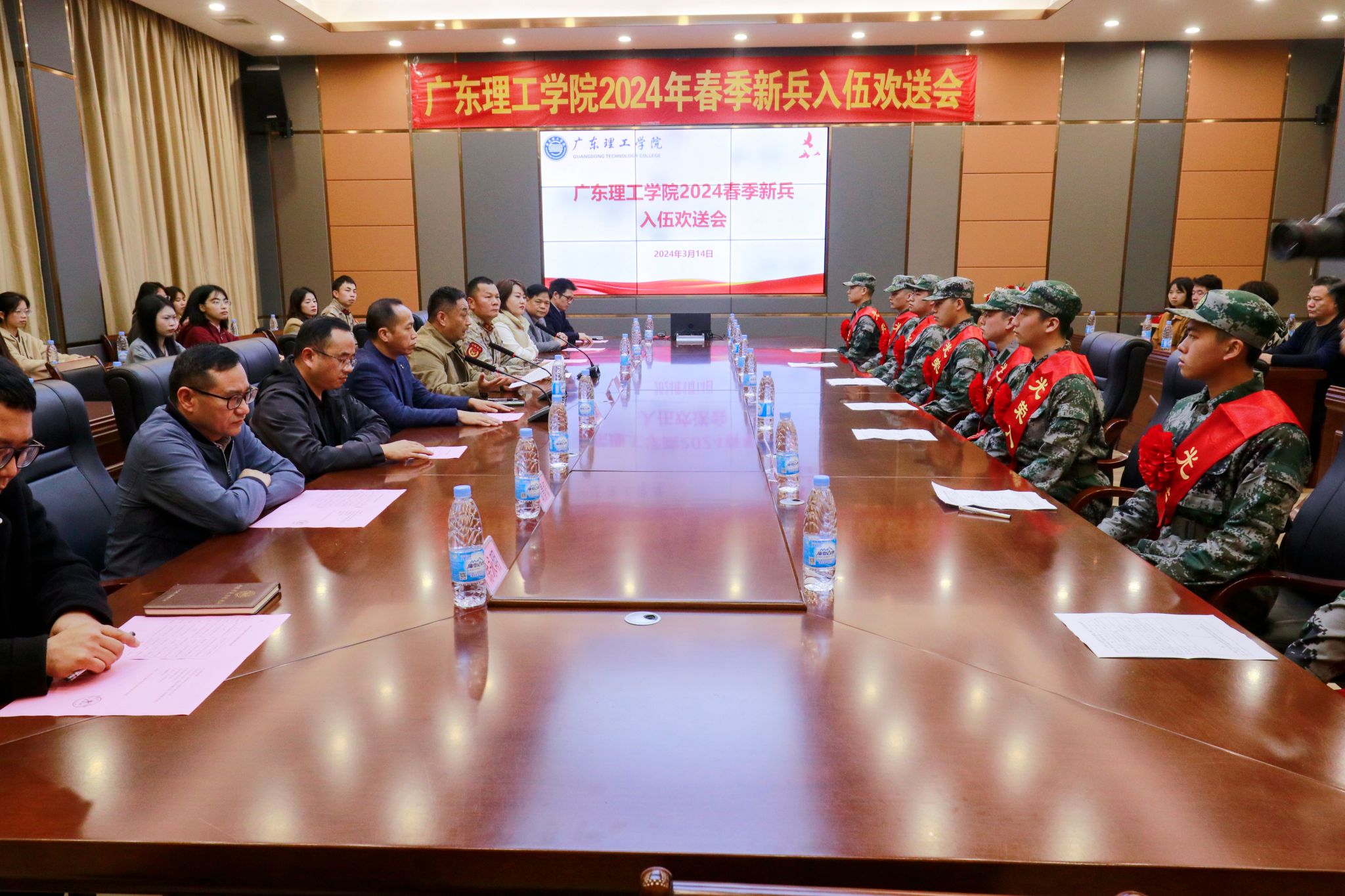 本网讯(武装部)3月14日下午,鸭脖官网在高要校区行政楼101会议室隆重举行2024年春季新兵入伍欢送仪式,为即将踏上军旅征程的8名新兵送行。学校党委副书记张宗珊、学生处处长谭蒙革、党委宣传部部长张冬、教务处副处长陈木荣以及相关二级学院征兵工作小组负责人和学生辅导员、家长参加会议。武装部部长曾荫初主持会议。