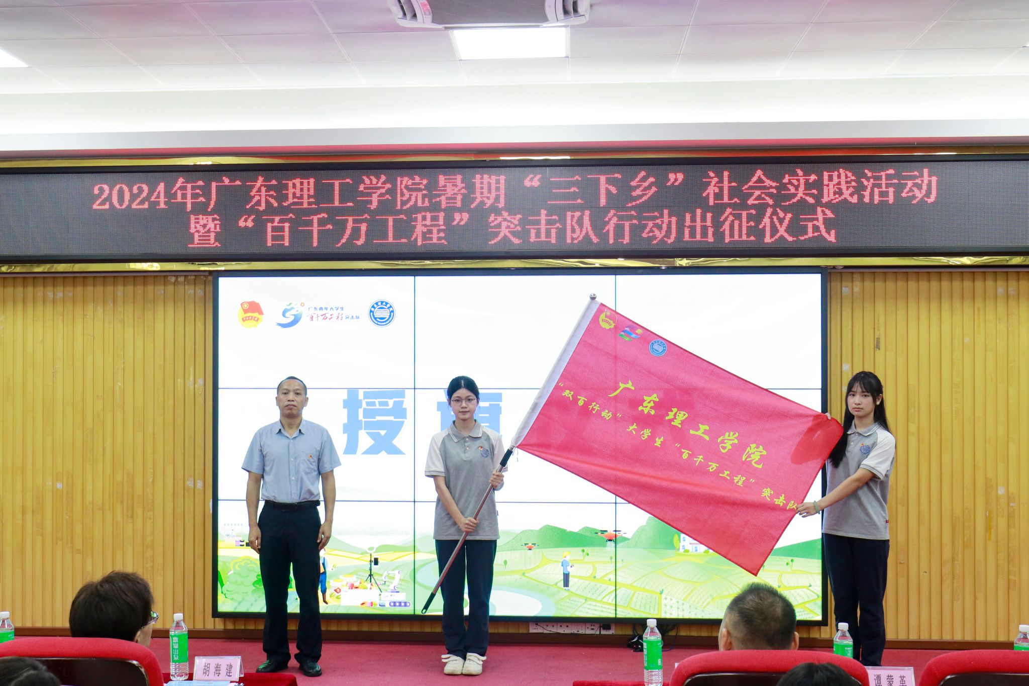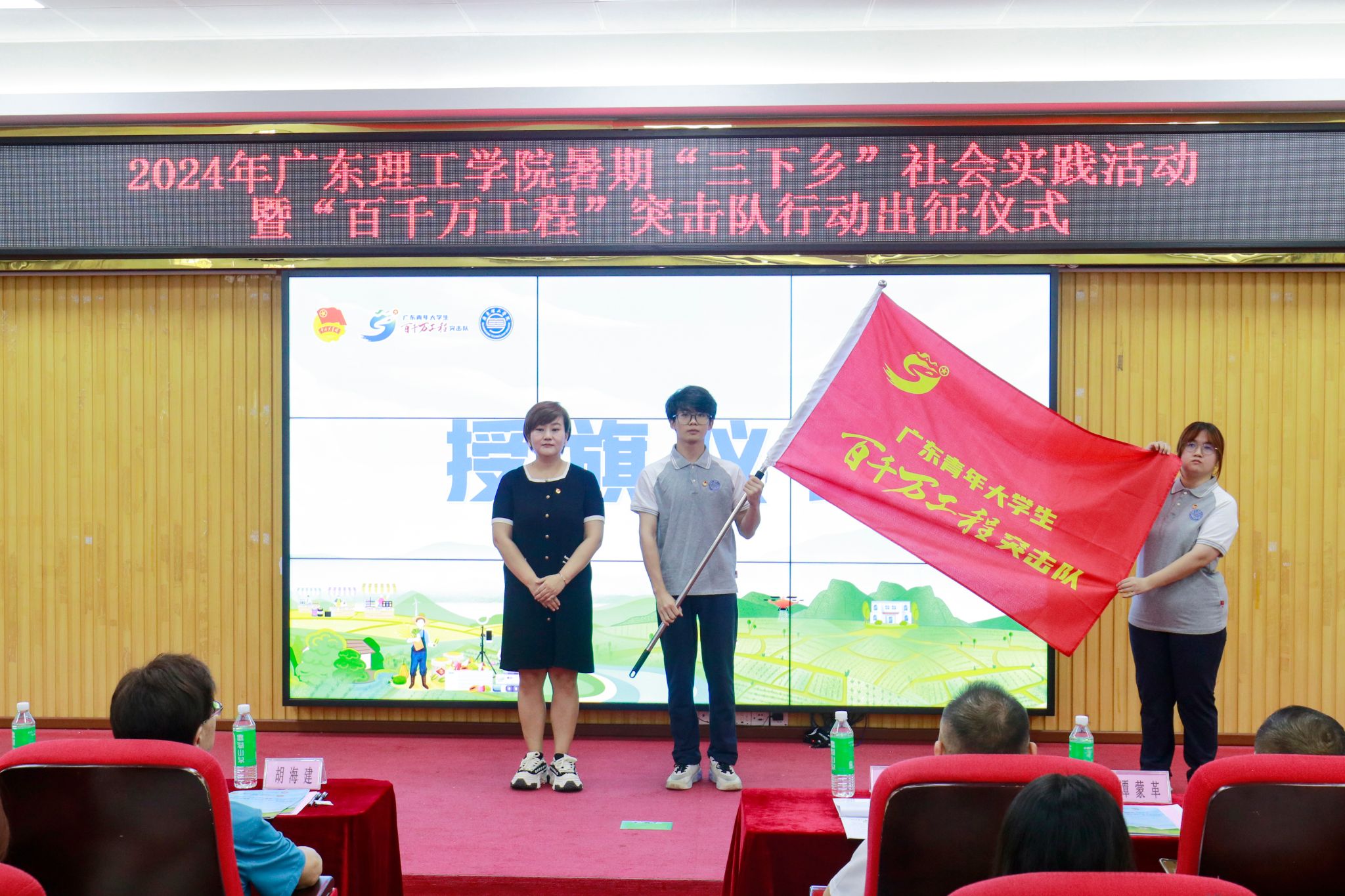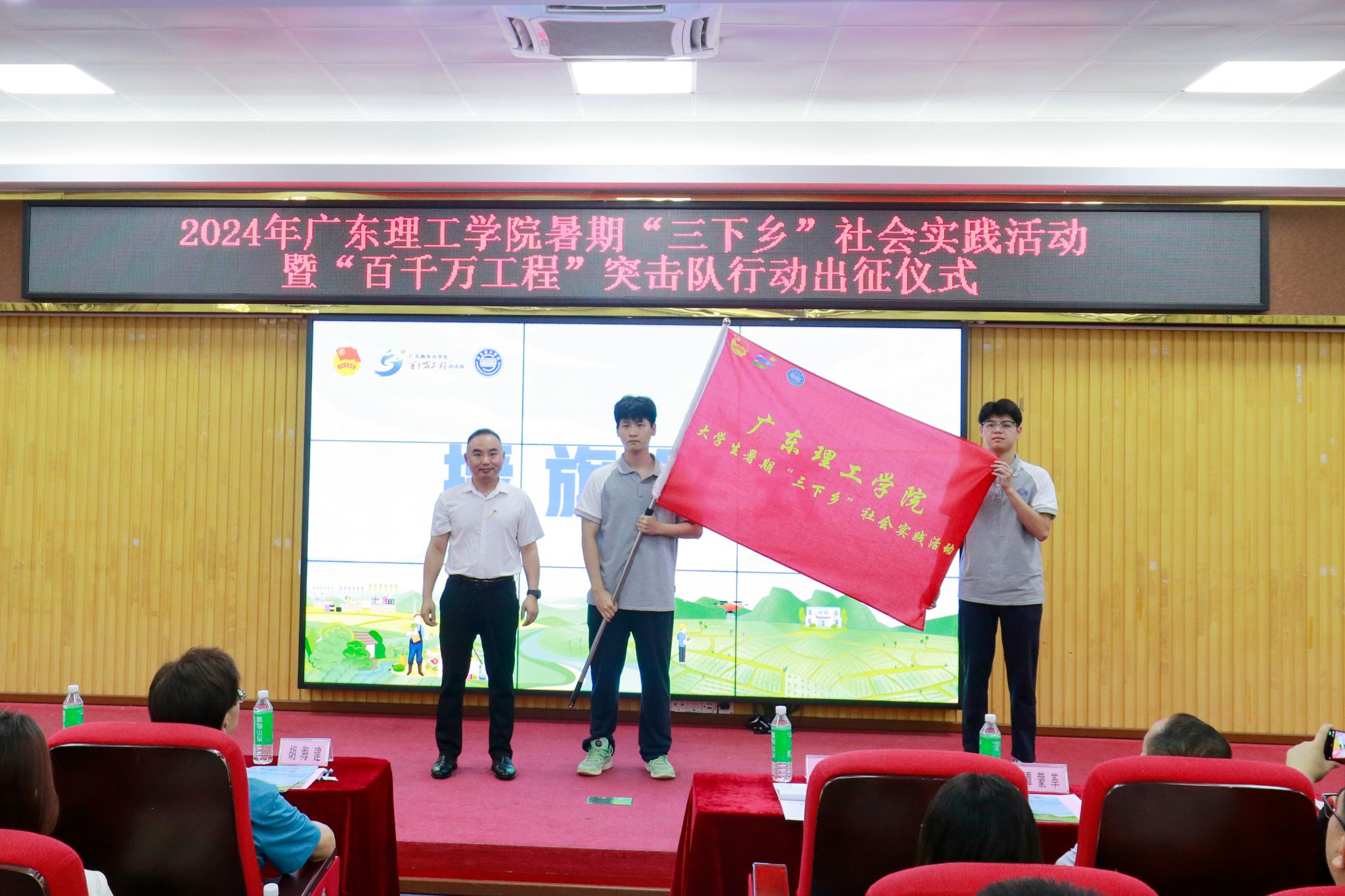 授旗仪式上,廖振宇、张冬、谭蒙革分别为突击队代表授“yabo鸭脖官网大学生暑期‘三下乡’社会实践活动”总旗、“广东青年大学生‘百千万工程’突击队”旗帜及“双百行动”活动总旗。
