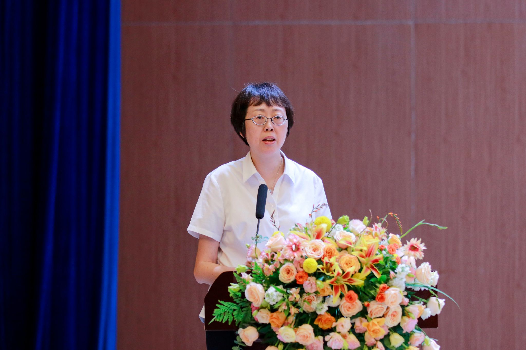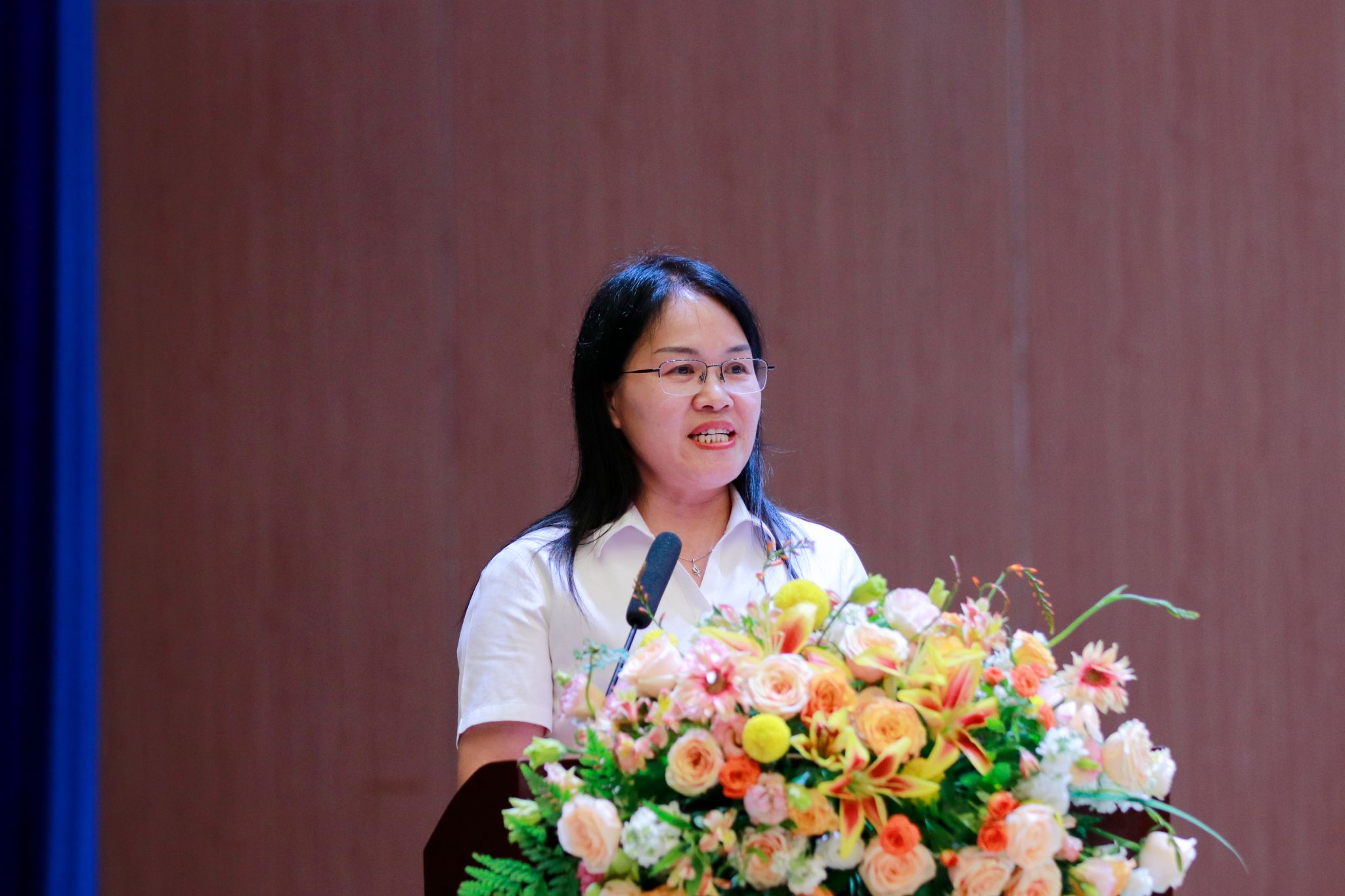 优秀教师代表盛洁发言,她分享了自己从教二十多年来对教师职业的理解和思考。一是教师是光荣的,教书是严肃的,讲台是神圣的;二是持续学习和自我提升;三是认清教育本质,注重学生全面发展。