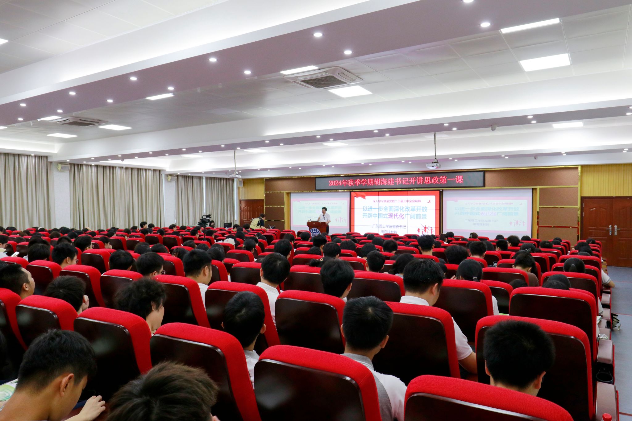 本网讯(党委宣传部 刘赛赛 新闻中心 郭景花/吴泓广/叶佳怡)为深入学习和贯彻党的二十届三中全会精神,9月30日上午,鸭脖官网党委书记胡海建在高要校区42栋学术报告厅,以“深入学习领会党的二十届三中全会精神,以进一步全面深化改革开放,开辟中国式现代化广阔前景”为主题,为会计、财务管理等专业的学生讲授了生动而深刻的“思政第一课”。