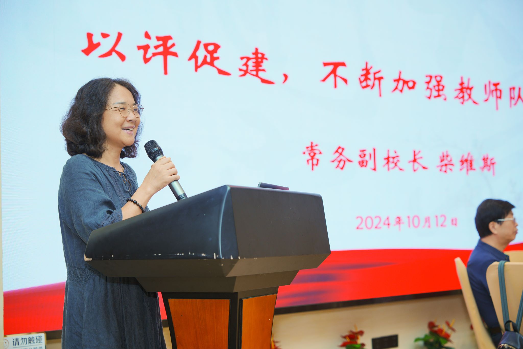 常务副校长柴维斯作题为“以评促建,不断加强教师队伍建设”的专题报告。她详细介绍了本科合格评估的背景、意义以及学校为此所做的各项准备工作。报告指出,本科合格评估是学校发展进程中的一件大事,关乎学校的长远未来以及全体师生的切身利益。因此,学校将以此次评估为契机,进一步加强教师队伍建设,提高教育教学水平,为学校的长远发展奠定坚实基础。同时,她也希望广大教师能够高度重视并积极投身其中,共同为迎接评估工作贡献自己的力量。