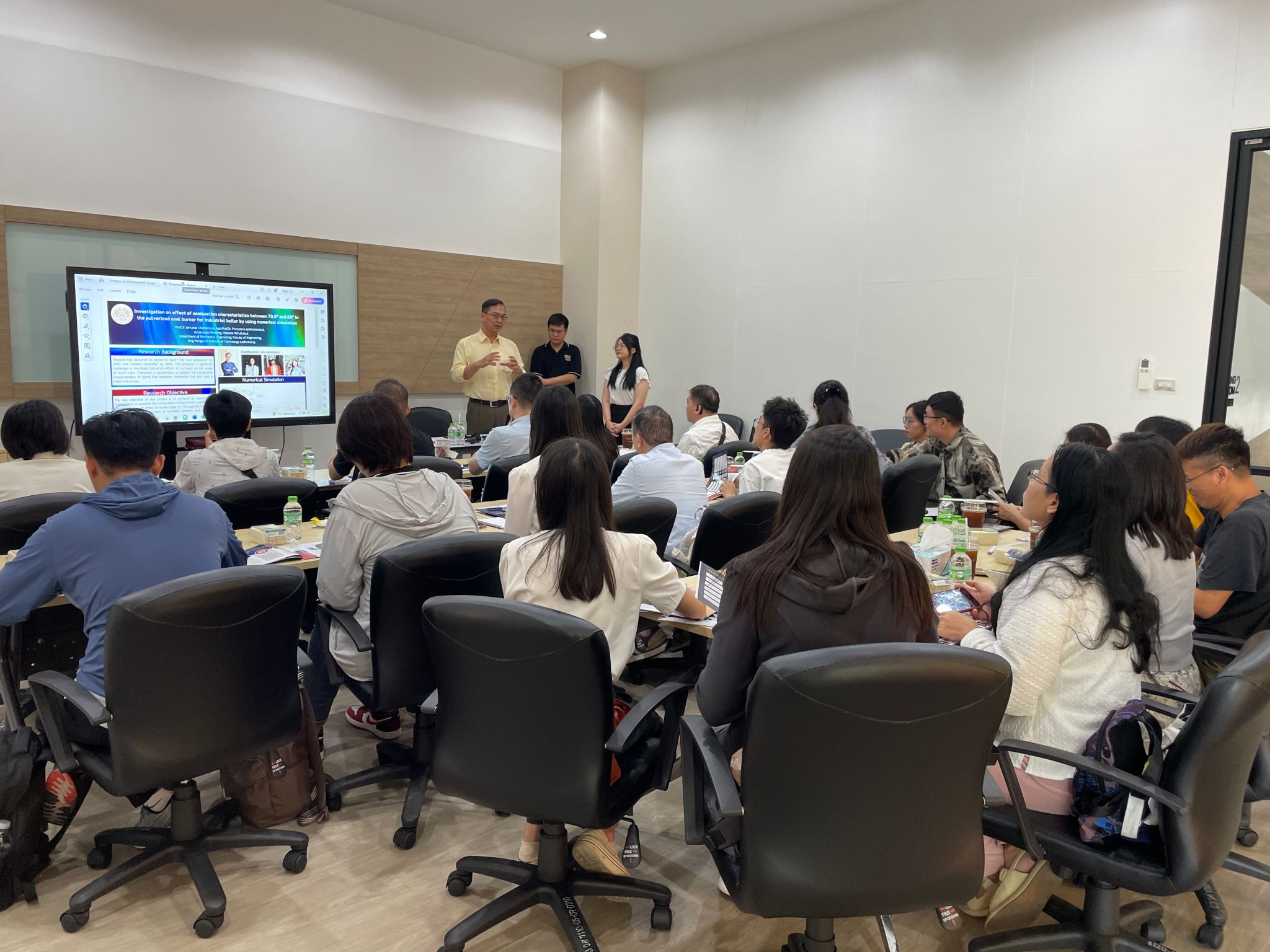 泰国先皇理工大学(简称KMITL)成立于1960年,是一所以工科见长,学术实力强劲,校园环境优美,且拥有广泛国际交流合作的泰国顶尖公立大学。在这里,学校代表团不仅参观了该校的教学设施、科研项目以及校园文化,深入了解了泰国先皇理工大学的教学理念和方法,还参观了学校的实验室和工作室,聆听了Jarruwat Charoeneuk教授生物燃烧器这一创新技术研究成果的分享,并就设备是否与企业合作并投入使用等问题与教授进行了深入交流,为鸭脖官网教师在科技创新道路上提供了新的灵感与思路。