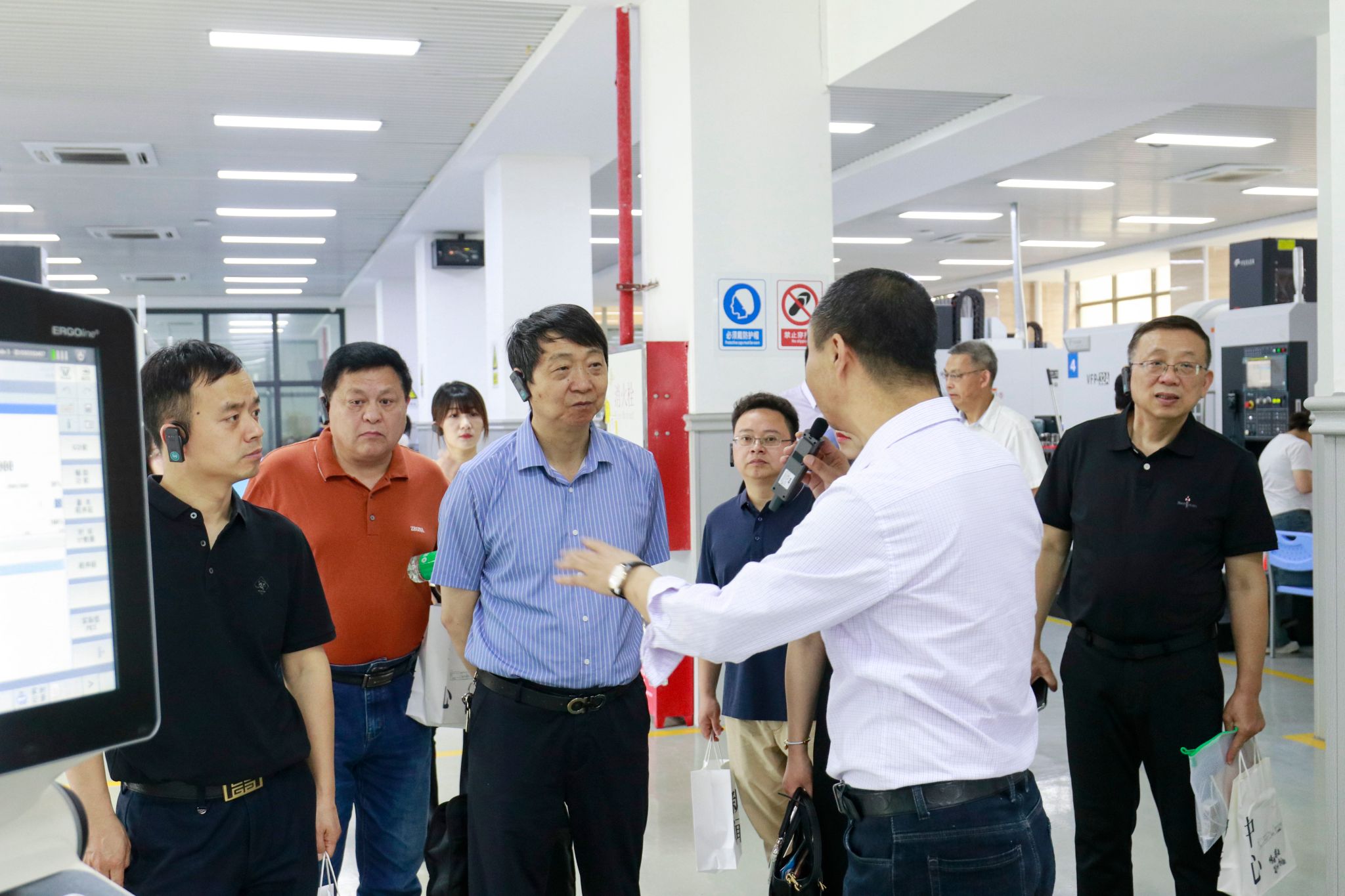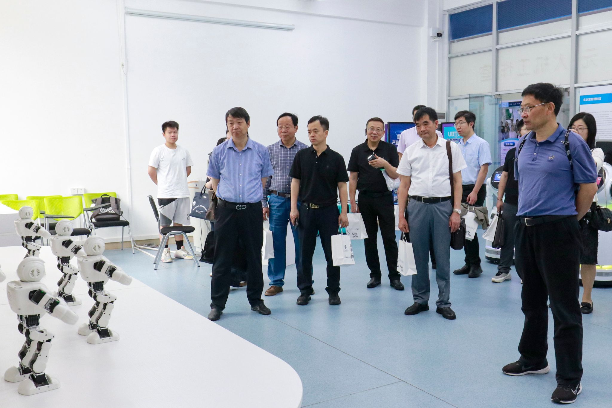 考察团在校领导的陪同下实地走访了学校特色教学场所,包括加工中心实训基地、机器人与智能控制实验中心、机器视觉与智能检测工程技术中心、数智会计产业学院等。考察团还参观了学校升本十年成果展,通过详实的数据和图文了解学校十年来取得的发展变化和凸显成效。
