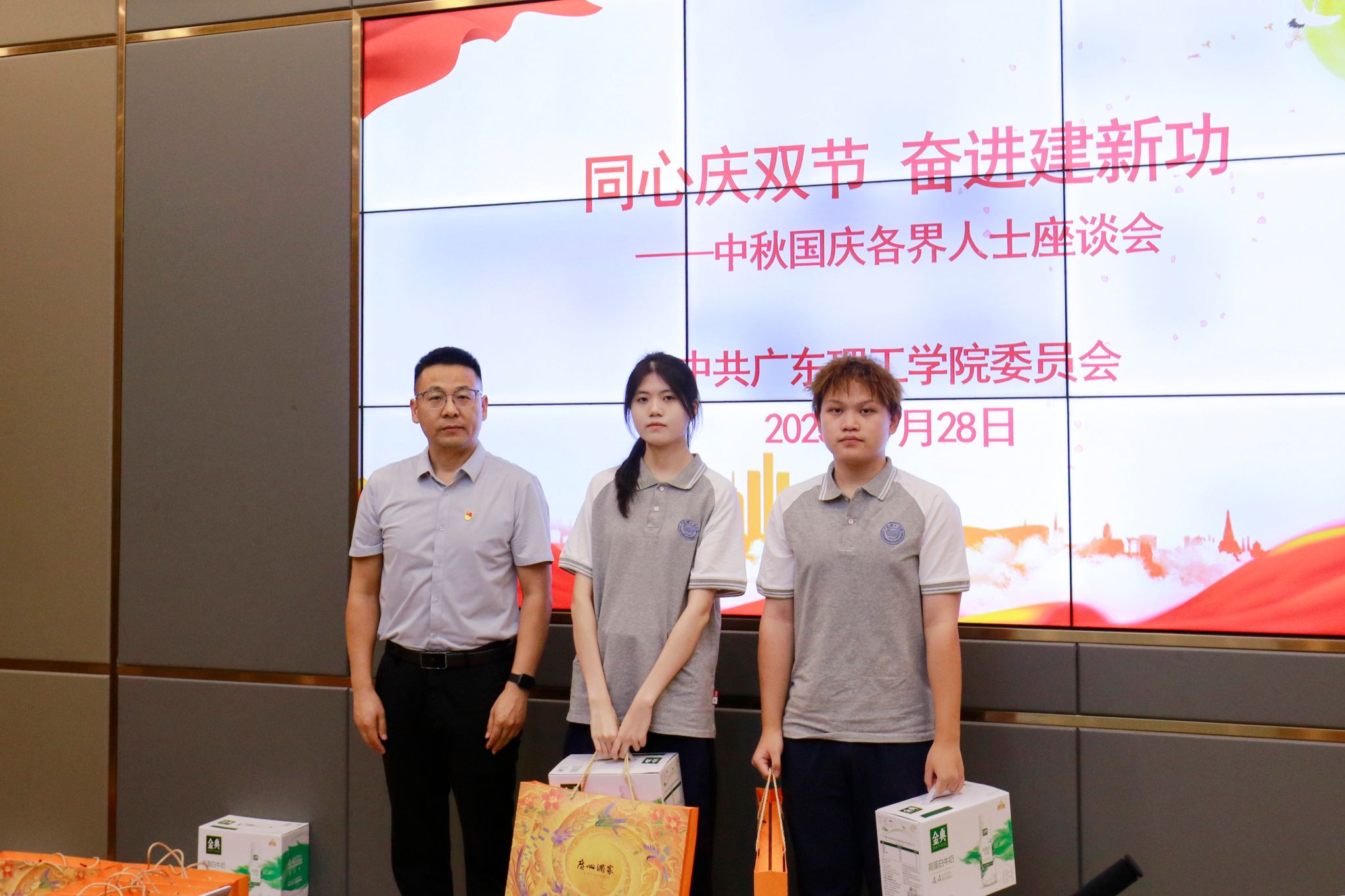 学校领导与参会代表共享月饼,并为参会代表送上节日礼品,传递组织关怀与温暖。座谈交流环节,民主党派代表罗源凯、张智明教授等围绕学科建设、师资培养等方面建言献策,学生代表索珍等表态将积极践行“强国有我”青春誓言。
