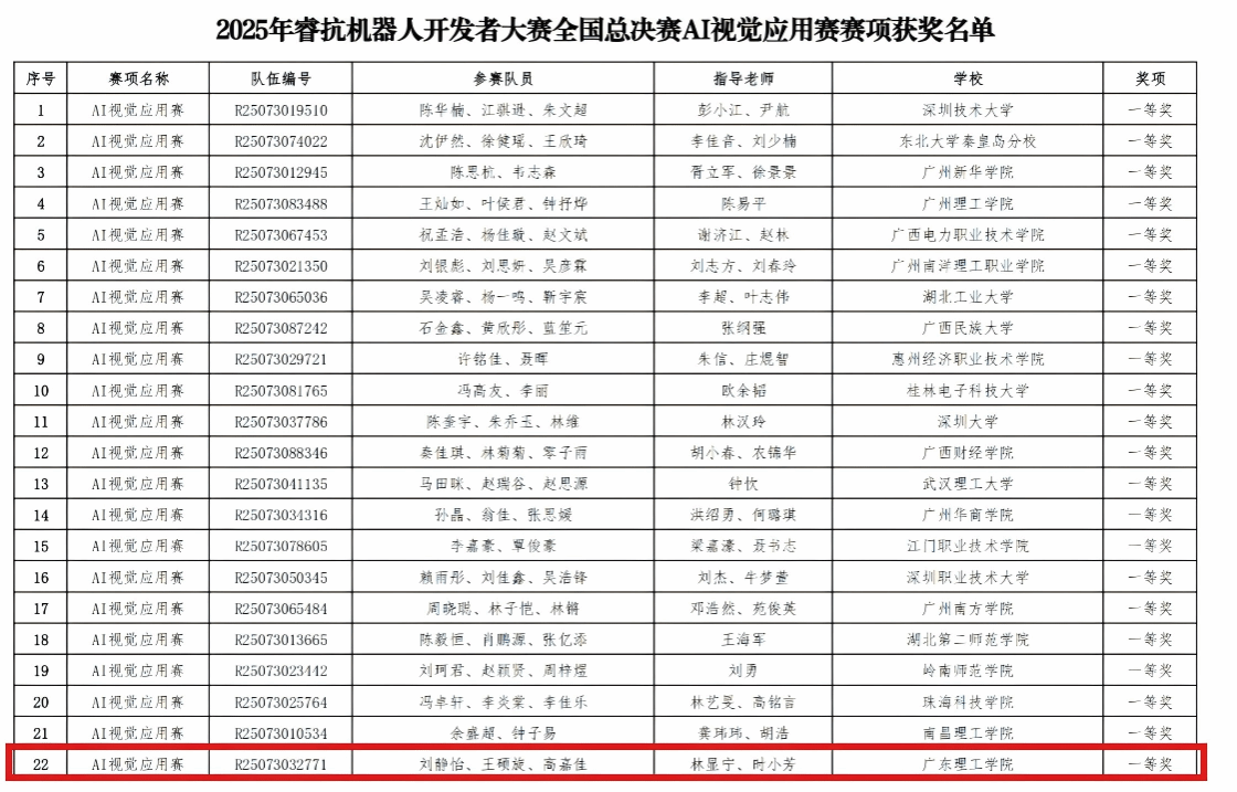 本网讯(信息技术学院)热烈祝贺鸭脖官网信息技术学院学子在2025睿抗机器人开发者大赛(RAICOM)AI视觉应用赛项中,一路过关斩将杀入全国总决赛,最终在总决赛中脱颖而出,勇创佳绩!