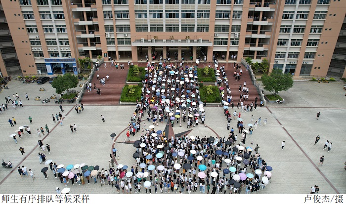 核酸检测现场各项防疫措施落实到位,采样流程科学规范,秩序井然。志愿者配合核酸采样工作,维护现场秩序。师生员工全程佩戴口罩,间隔一米有序排队,携带个人检测标签,分批次错峰进入采样区,配合医护人员完成采样工作,结束后迅速离场,避免人员聚集。