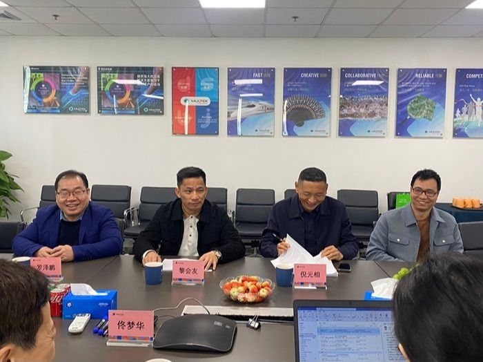 首站来到珠海斗门超毅电子有限公司,公司管理层对党委副书记黎会友一行的到来表示热烈欢迎。针对专业人才培养方案、学生实习实践基地建设等展开座谈。