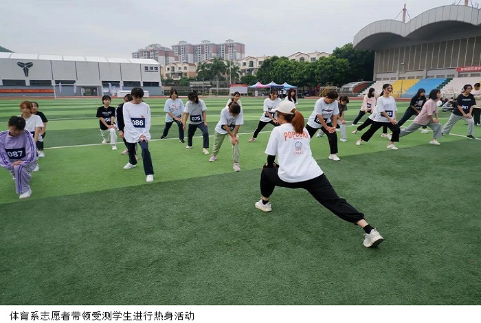 测试当天,一大早田径场响起励志背景音乐以调动气氛,体育系志愿者带领被测学生分组热身。随后按照规范流程进行了身高、体重、坐位体前屈、立定跳远、仰卧起坐(女)、引体向上(男)、50米跑、800米跑(女)、1000米跑(男)项目的测试。为确保此次体质健康测试工作顺利进行,党委副书记张宗珊、体育系主任郭鼎文亲到现场指导测试工作并看望受测学生。体育系体质健康及场地管理中心积极配合,精心筹备,认真安排测试场地和器材,整个测试工作组织严密有序,安全保障措施周到,学生积极参与,圆满完成省教育厅对鸭脖官网学生的抽查测试工作,得到了省教育厅领导和专家组的一致好评。