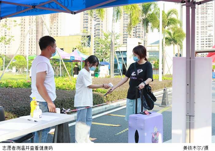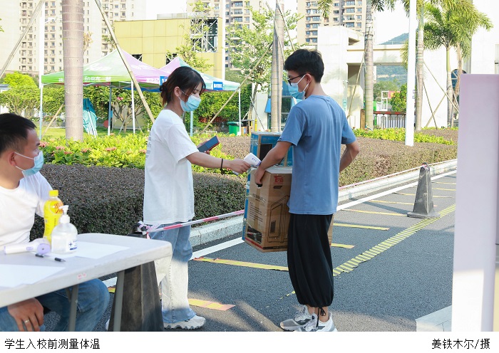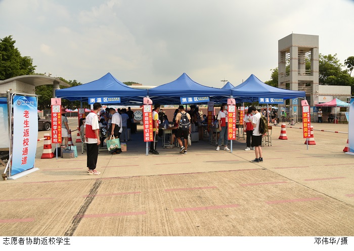 学生处李老师介绍,学校前期已经下发通知让返校学生注意相关事项,了解返校前、中、后期的各类情况,并由辅导员通知到位。安排人员对省外学生进行登记统计,保障他们安全及时地返校。报到时,派驻辅导员和志愿者轮班在校门口进行测温,查看“粤康码”、行程码等证明,确认无误后方可入校。校门口还配置了消毒人员进行消杀,进一步强化安全措施。因防疫要求,陪同人员不能入校,学校安排志愿者对返校学生进行协助,让学生们安心返校。