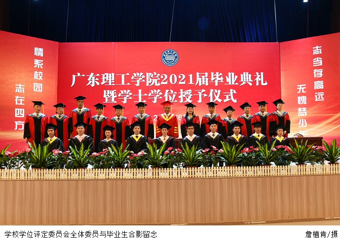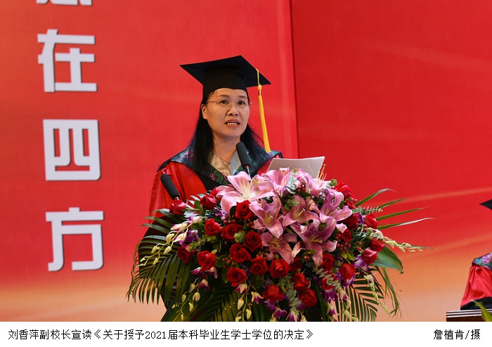 刘香萍副校长宣读《关于授予2021届本科毕业生学士学位的决定》。张湘伟校长向授予学士学位的学生代表颁授学位证书、为其拨正流苏,并合影留念。