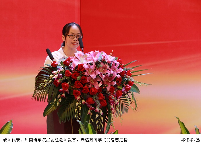 教师代表、外国语学院吕丽红老师表达了对同学们的眷恋之情。今年毕业季恰逢中国共产党成立100周年,在这个象征着圆满而又寄托希望的毕业季,她以“修德、求是、笃行、创新”的校训展开,鼓励毕业生们去爱、去追梦、去创新、去奋斗。