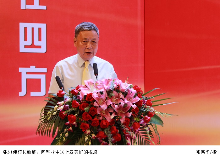 张湘伟校长在致辞中代表学校祝贺同学们圆满完成学业。他寄语全体毕业生五点希望,一是注重提升自身的道德修养;二是树立创新精神,不断学习;三是始终坚持积极向上,勇于担当;四是修炼格局,理性选择;五是志存高远,矢志坚守。他祝福毕业生在职场中乘风破浪,不断历练、成长,不断展示自己的才华与人格魅力,为国家为社会做出应有的贡献。