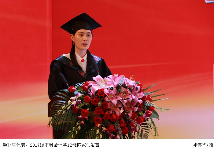毕业生代表、2017级本科会计学12班陈家莹代表全体毕业生们向学校领导、老师们、辅导员们致以最衷心的感谢。她谈到,四年来,学校见证了他们的成长,而他们也有幸见证了学校的变化。她分享了三点感悟,勉励同学们坚守初心、脚踏实地、勇担使命,在祖国最需要的地方建功立业,共同演绎新时代中国的美好续集。