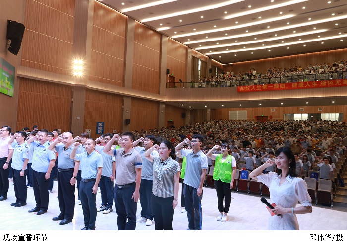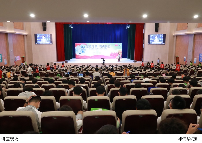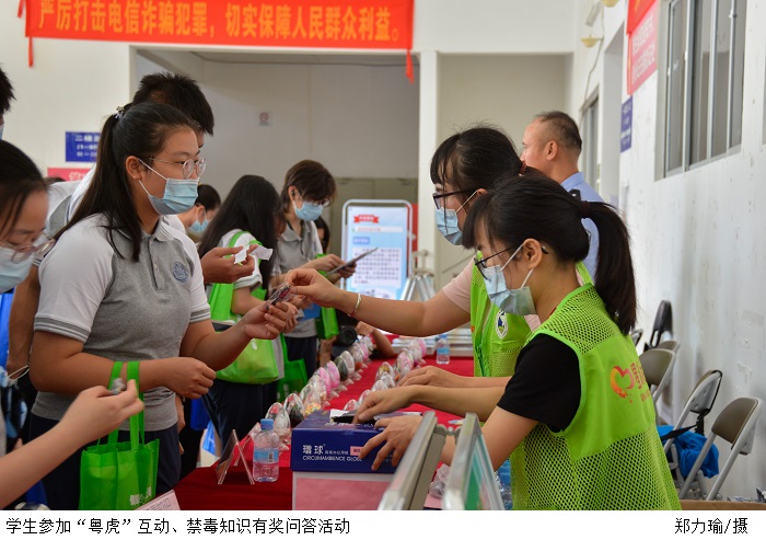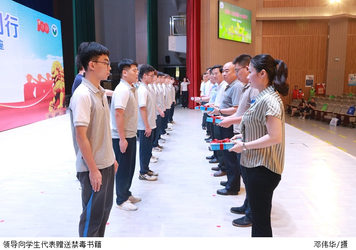 现场还进行了禁毒宣誓、领导向学生代表赠送禁毒书籍环节。讲座结束后,广大师生到展区参与“粤虎”互动、禁毒知识有奖问答活动及参观禁毒、团建、反诈、扫黑、交通安全等有关知识展览。