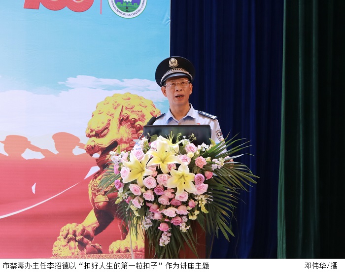 李招德主任以“扣好人生的第一粒扣子”作为讲座主题。他通过生动的图文、视频介绍了毒品种类,从肇庆市真实的案例讲解了毒品的特征及毒品危害,阐释了毒品肆虐蔓延的原因。他为学生们远离毒品提出三点意见,一是识别诱惑,拒绝毒品;二是提高防护,谨慎交友;三是珍惜生命、幸福、理想。