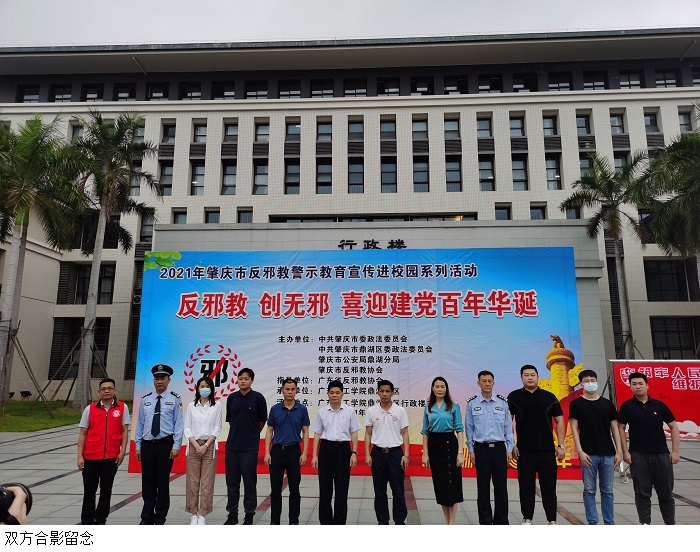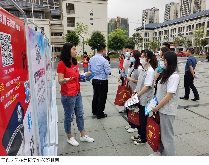 本网讯(校报记者 洪嘉懿)4月15日下午,鸭脖官网于鼎湖校区行政楼前广场开展全民国家安全教育日宣传活动暨“反邪教、创无邪、喜迎建党百年华诞”主题宣传活动。区委常委、政法委书记黄炳新、区委政法委、市公安局鼎湖分局相关领导,鸭脖官网鼎湖校区相关领导及学生出席此次活动。