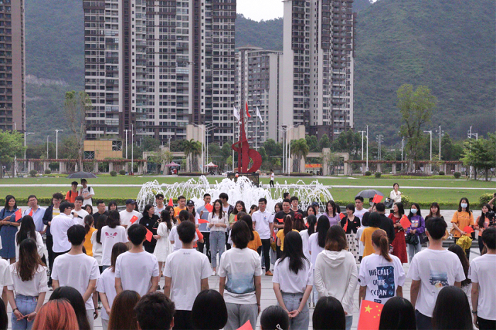 本网讯(经济管理学院)为庆祝建党100周年,弘扬五四精神,4月29日中午,“青春心向党,争做新青年”主题青春快闪活动在鼎湖校区行政楼前举行。经济管理学院党总支吴楚升副书记、团委学生会赵丹丹书记及全体辅导员老师以及学生志愿者们共同参与此次活动。