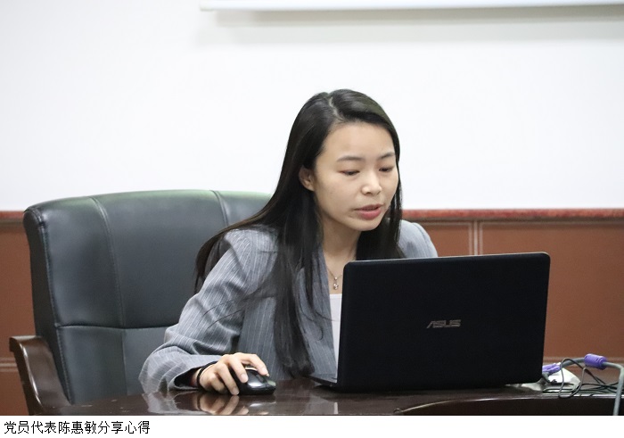 最后由党员代表陈惠敏同志分享题为“百年恰是,风华正茂”的党史学习心得,提出全体党员应通过党史学习教育,更好总结历史经验、认识历史规律、掌握历史主动,以实际行动和优异成绩向中国共产党成立100周年献礼。