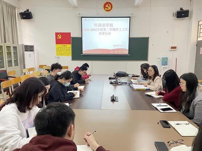 本网讯(外国语学院新闻中心)为了衔接上学期期末的工作,安排调整新学期的工作进度,3月3日上午,外国语学院在37101会议室召开学工新学期工作安排会议。参加会议的有党总支吕丽红书记、吕媛副书记以及全体辅导员老师。