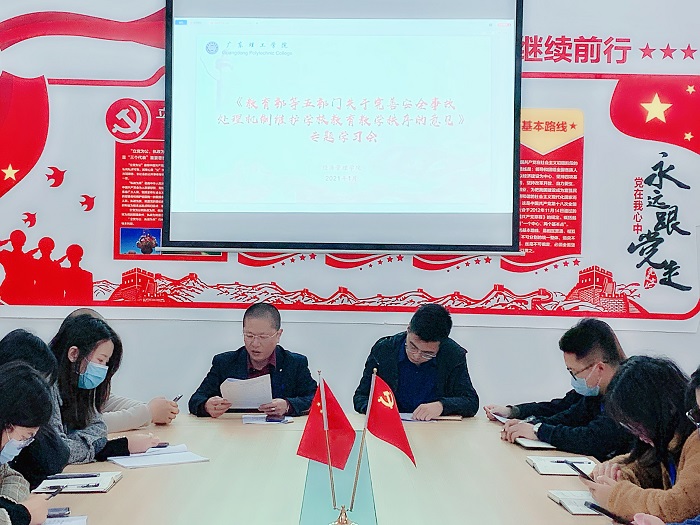 学习会上,甘书记宣读《教育部等五部门关于完善安全事故处理机制维护学校教育教学秩序的意见》文件,并结合我院相关情况重点阐释依法处理安全事故纠纷与依法打击“校闹”行为等内容,要求全体辅导员加强学校安全事故预防,依法、规范、公正调解学校安全事故纠纷,依法从严惩处“校闹”行为。
