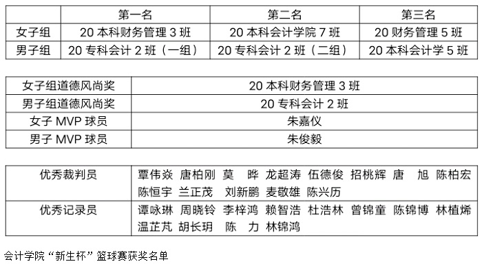 经过数轮激烈的角逐,赛事结束。12月15日举行闭幕式,出席闭幕式的领导及嘉宾有会计学院党总支徐永明副书记、会计学院团委学生会詹庆文书记、会计学院辅导员刘娟老师、张珊珊老师、梁留阳老师、罗广超老师。最后由主持人宣读本次会计学院“新生杯”篮球赛的获奖队伍及个人,并进行全体合影留念。