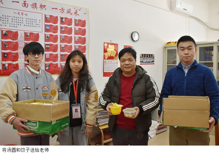 本网讯(信息技术学院 纪以欣)为了进一步弘扬中华民族的传统文化,感恩教师的谆谆教诲,12月21日,信息技术学院学生党支部开展了“暖心冬至”免费送汤圆与饺子活动,参与此次活动的成员的有信息技术学院党总支梁星全书记、冷云峰副书记、学生党支部书记胡娇铃老师以及学生党支部成员。