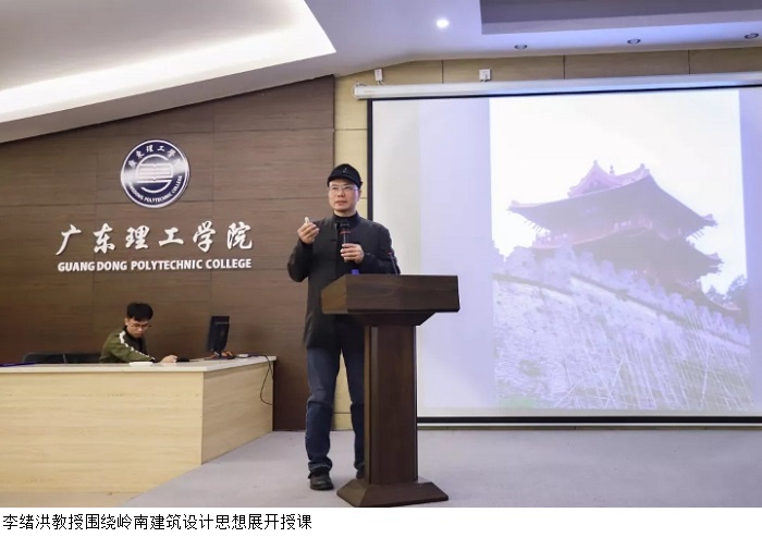 李教授通过两广地区的名称为切入点,围绕着岭南建筑设计思想展开授课。他介绍了岭南地域的文化历史并以封开广信塔为例子,强调了色调和设计结构的实用性。此外他还结合了岭南四大园林要素对岭南当代建筑的设计理念进行介绍,提议同学们可借鉴其中精华运用于自身作品中。