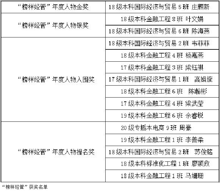 各新生班级经过激烈竞争,20级本科国际经济与贸易4班最终斩获金奖,20级本科国际经济与贸易2班、20级本科电子商务3班斩获银奖,成功晋级校级新生班级风采决赛;20级本科互联网金融2班、20级本科金融工程3班、20级本科国际经济与贸易3班斩获铜奖;20级本科金融工程5班获最佳人气奖。